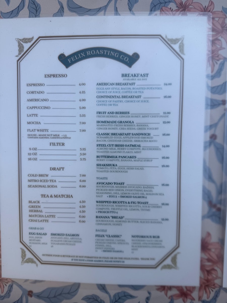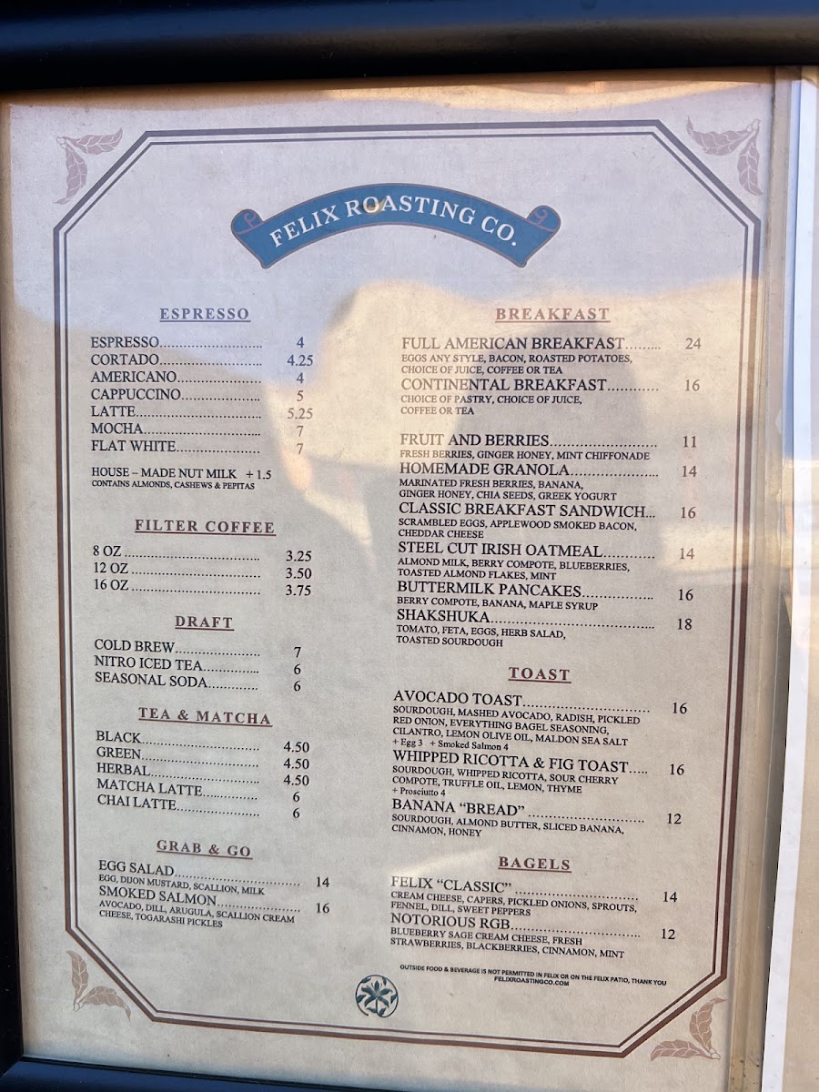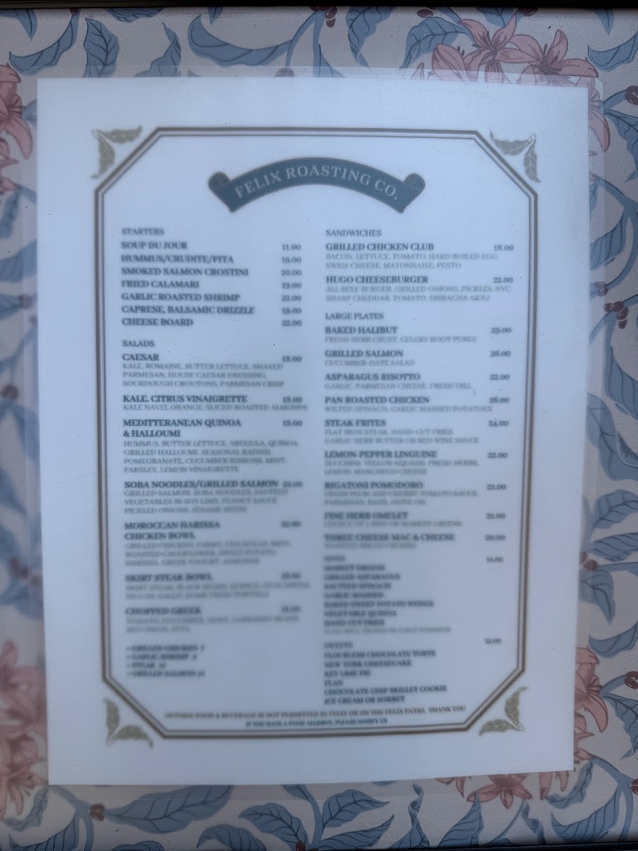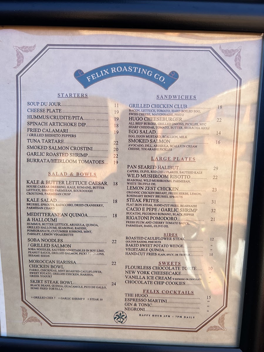 Felix Roasting Co.'s menu offers a delightful mix of flavors across various categories, providing something for every palate. The starters are perfect for sharing, with options like Hummus, Crudite and Pita and Smoked Salmon Crostini. For a refreshing salad, you can try the Caesar Salad or the vibrant Kale, Citrus Vinaigrette. The Moroccan Harissa Chicken Bowl stands out among the hearty bowls, while the sandwiches, such as the Grilled Chicken Club and the Hugo Cheeseburger, offer satisfying choices. Moving to the larger plates, the Mediterranean Branzino and Golden Pan-Roasted Chicken are both exceptional, and the Mushroom Truffle Risotto is a rich, flavorful option. On the side, enjoy the Sauteed Garlic Spinach or Grilled Asparagus, and for dessert, the Flourless Chocolate Torte and New York Cheesecake are decadent choices to end the meal. The beverage selection is equally impressive, with a range of espresso drinks, from Cappuccino to Nitro Iced Tea, and refreshing options like Matcha Latte and Chai Latte. For breakfast, the Felix "Classic" Bagel and Buttermilk Pancakes are perfect picks, while the Smoked Salmon Sandwich and Avocado Toast offer lighter yet fulfilling options to kick-start your day. Overall, the menu at Felix Roasting Co. combines elegance and comfort in each dish, ensuring a memorable dining experience.