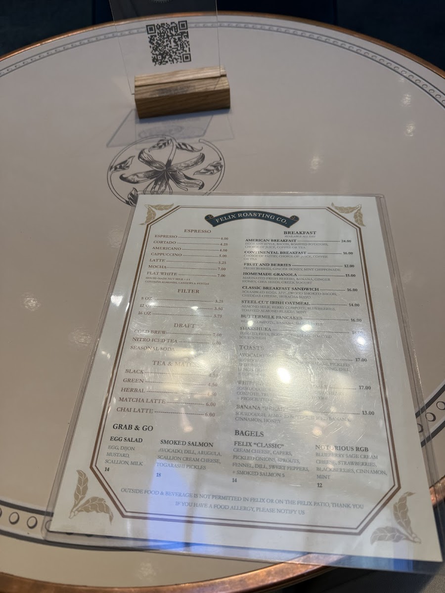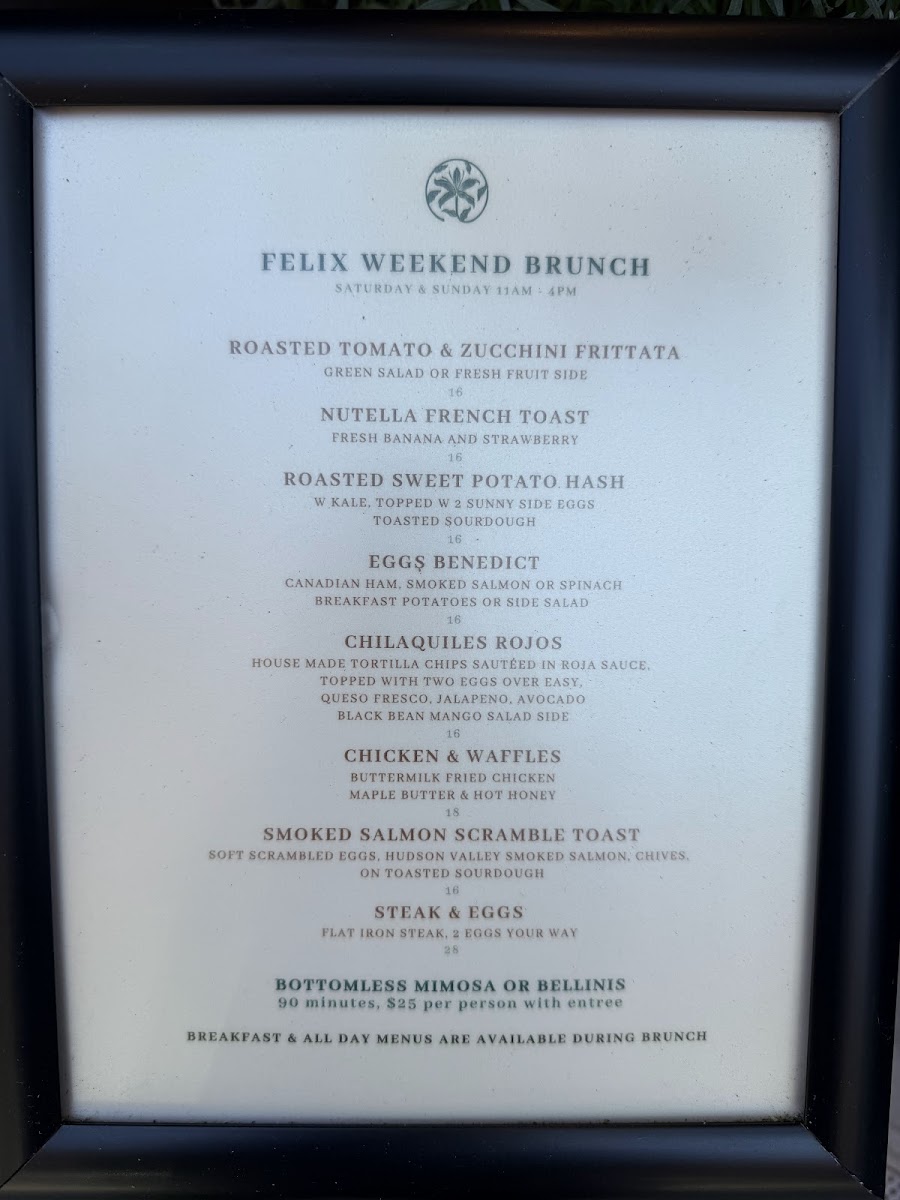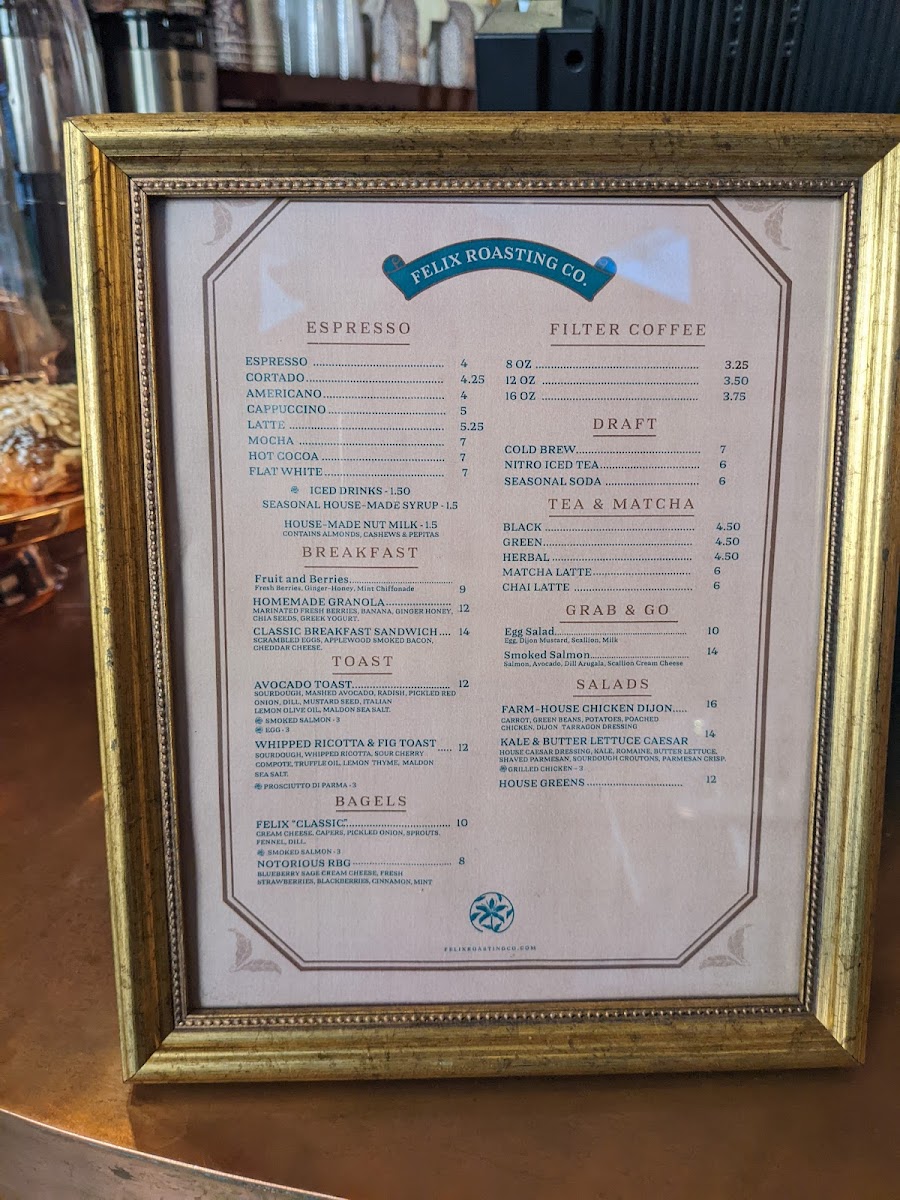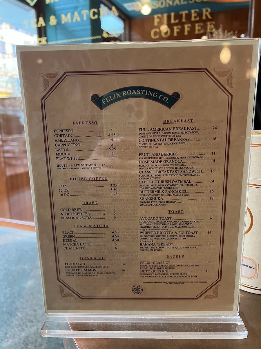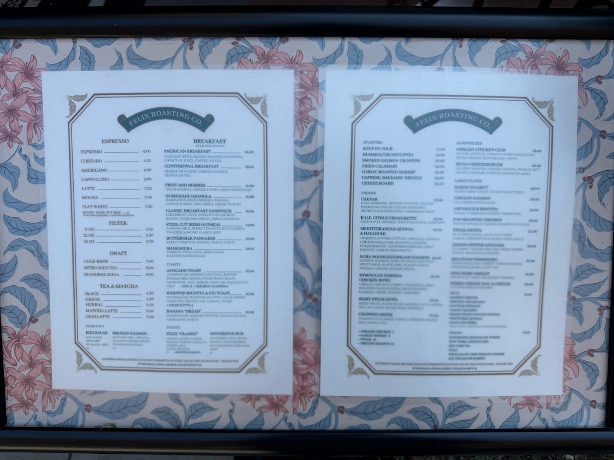 Felix Roasting Co.'s menu offers a delightful mix of flavors across various categories, providing something for every palate. The starters are perfect for sharing, with options like Hummus, Crudite and Pita and Smoked Salmon Crostini. For a refreshing salad, you can try the Caesar Salad or the vibrant Kale, Citrus Vinaigrette. The Moroccan Harissa Chicken Bowl stands out among the hearty bowls, while the sandwiches, such as the Grilled Chicken Club and the Hugo Cheeseburger, offer satisfying choices. Moving to the larger plates, the Mediterranean Branzino and Golden Pan-Roasted Chicken are both exceptional, and the Mushroom Truffle Risotto is a rich, flavorful option. On the side, enjoy the Sauteed Garlic Spinach or Grilled Asparagus, and for dessert, the Flourless Chocolate Torte and New York Cheesecake are decadent choices to end the meal. The beverage selection is equally impressive, with a range of espresso drinks, from Cappuccino to Nitro Iced Tea, and refreshing options like Matcha Latte and Chai Latte. For breakfast, the Felix "Classic" Bagel and Buttermilk Pancakes are perfect picks, while the Smoked Salmon Sandwich and Avocado Toast offer lighter yet fulfilling options to kick-start your day. Overall, the menu at Felix Roasting Co. combines elegance and comfort in each dish, ensuring a memorable dining experience.